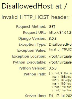 생성한 프로젝트에 settings.py 파일에 ALLOWED_HOSTS를 입력해줘야한다