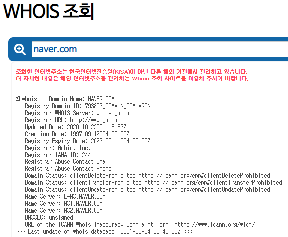 naver.com을 검색해보니 gabia에서 해당 도메인이 관리되는 것을 알 수 있었습니다