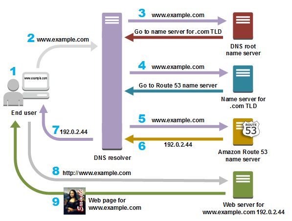 - Amazon Route 53 이름 서버는 example.com 호스팅 영역에서 www.example.com 레코드를 찾아 웹 서버의 IP 주소 192.0.2.44 등 연관된 값을 받고 이 IP 주소를 DNS 해석기로 반환합니다.