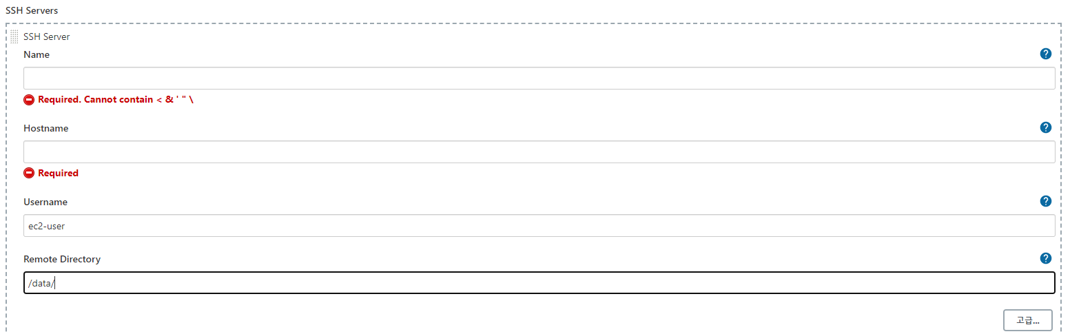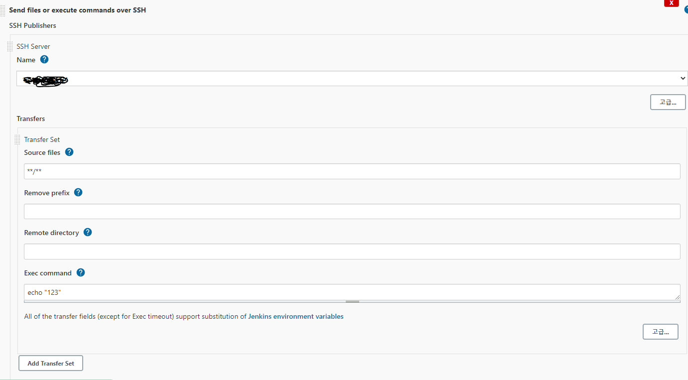 - Exec command : 파일 전송이 모두 끝난 이후에, SSH Server로 지정한 서버에서 실행될 스크립트를 지정할 수 있는 기능