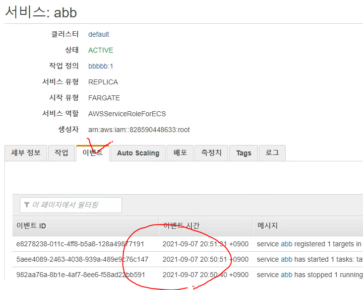 해당 서비스 클릭 후 이벤트를 보시면 컨테이너 생성 정보가 나옵니다