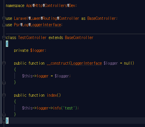그리고 $this를 사용하여 전역변수를 이용하여 logger 메소드로 접근하여
